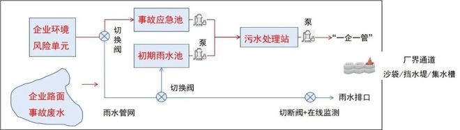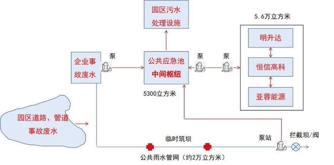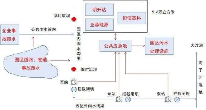 以雨水系統(tǒng)末端攔截轉(zhuǎn)輸、公共應急空間擴容為重點,建設完善園區(qū)第二級防控體系。在園區(qū)兩個公共雨水排口建設固定閘壩(閥)和轉(zhuǎn)輸泵站,配合雨水明渠臨時筑壩,形成2萬立方米緩沖空間,具備緊急攔截暫存和轉(zhuǎn)輸功能。依托綜合管廊架建設專門管道,將恒信高科、晉煤明升達、亞蓉能源等3家企業(yè)應急空間(5.6萬立方米)互連互通,并納入園區(qū)公共應急空間,實現(xiàn)所有企業(yè)事故廢水可通過園區(qū)公共應急池(中間樞紐)進入3家互連互通企業(yè)應急空間,形成覆蓋全域的事故廢水轉(zhuǎn)輸網(wǎng)絡。