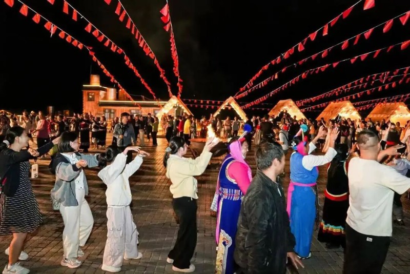 夜幕降臨,篝火照亮丙中洛農(nóng)家樂(lè)、文體廣場(chǎng)夜空,各族群眾手牽手,無(wú)限美麗穿越時(shí)空而來(lái),令人沉浸當(dāng)下忘了歸途。