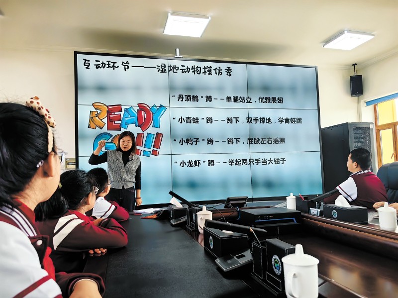 活動(dòng)中,中國(guó)林科院專家為當(dāng)?shù)貛熒鳌稘竦刈鳛樯鼡u籃的奧秘》科普講座,系統(tǒng)介紹濕地生態(tài)系統(tǒng)的功能及其對(duì)候鳥生存的重要性,并設(shè)計(jì)了濕地動(dòng)物模仿秀、知識(shí)問答等互動(dòng)環(huán)節(jié)。