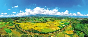 從空中俯瞰,隴川壩區(qū)宛如被打翻的調(diào)色盤,藍(lán)天白云為幕,萬畝稻田為毯,金黃的稻浪無邊無際,與村落、道路交織成一幅壯闊的田園油畫。陽光灑在稻穗上,折射出溫暖的光芒,每一陣風(fēng)吹過,都掀起層層疊疊的金波,能聽見稻谷碰撞的“沙沙”聲,那是豐收最動聽的旋律。