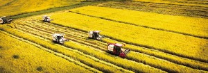 稻田里,一臺臺開足馬力的收割機(jī)在金色海洋中穿梭