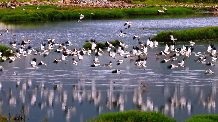 近日,云南會澤蔓海首次迎來上千只灰頭麥雞。鳥群一會兒像陣風(fēng)掠過水面,一會兒輕輕落在草地上,從空中看去,鳥群盤旋飛舞,像一條會飛的長河,與遠(yuǎn)處的山和晨光組成美麗圖畫。