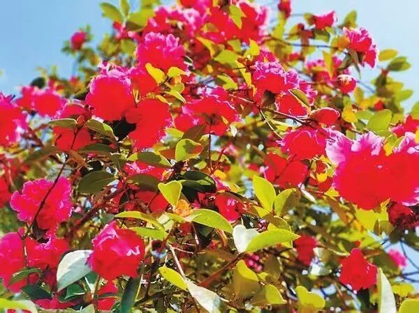 每年2月至4月,雞足山華嚴寺舊址的兩株古山茶花爭奇斗艷,如霞似錦。它們已有660年,盛開之時,火紅的花朵在綠意盎然的山間遙相呼應(yīng),成為萬眾爭簇的網(wǎng)紅打卡地標。