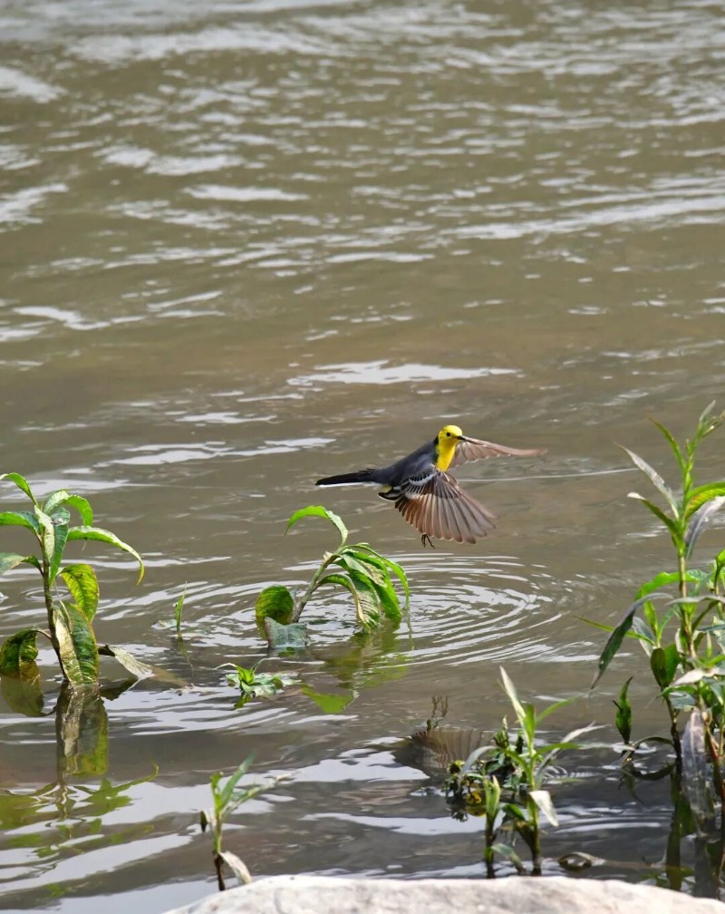 當(dāng)太陽(yáng)初啟,晨霧未散時(shí),在怒江江畔的的草叢里、石頭上已躍動(dòng)著幾抹靈動(dòng)的金黃——這便是黃頭鹡鸰(學(xué)名:Motacilla citreola),因頭頂那抹宛如金箔點(diǎn)染的羽冠,在江水墨色的映襯下更顯奪目,恰似水墨長(zhǎng)卷中破墨而出的“點(diǎn)睛之筆”。