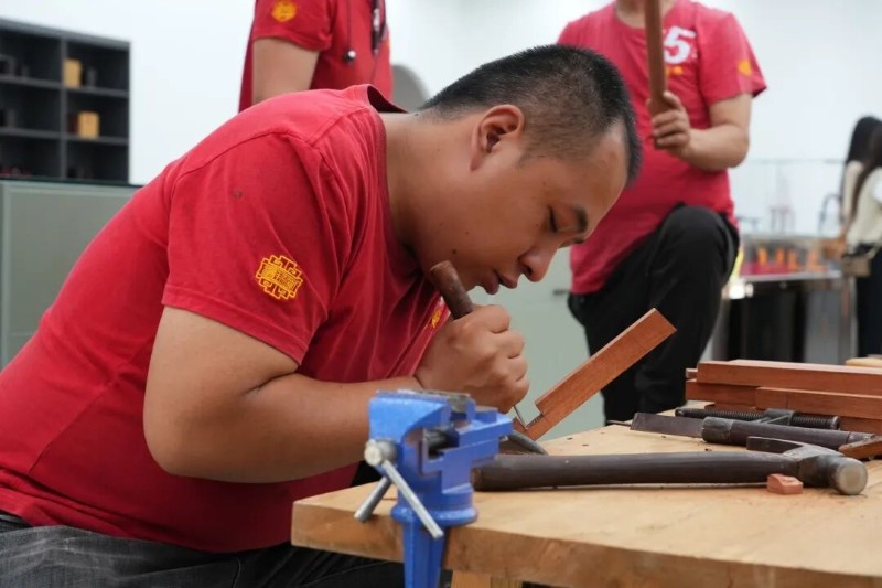 值得一提的是,此次的技能大賽中的榫卯制作過(guò)程,匠人們手握鑿刀抵住木料,木槌落下時(shí)手腕輕轉(zhuǎn),榫頭與卯眼嚴(yán)絲合縫咬合,盡顯手工開(kāi)榫的魅力。