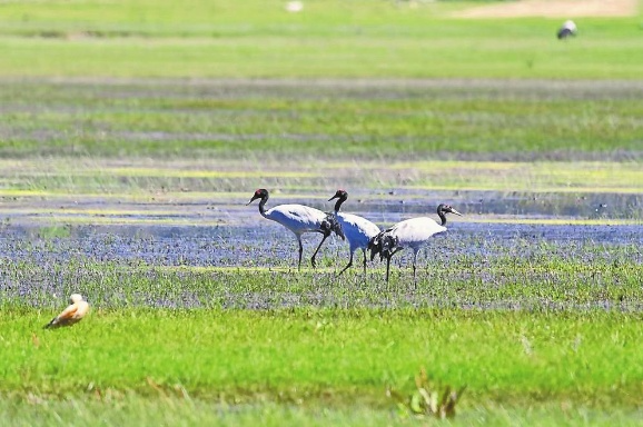 黑頸鶴在納帕海濕地覓食。陳志明 攝