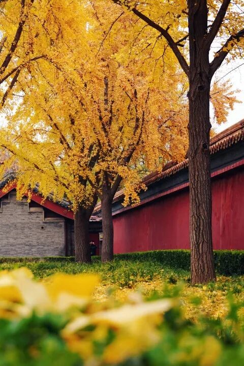 銀杏樹形高大,挺拔壯觀,葉片形狀如折扇,入秋葉子逐漸由綠色變?yōu)辄S色,目前正呈現(xiàn)出漂亮的漸變顏色。金色的銀杏葉與紅墻古建相得益彰,頗有古韻秋色。