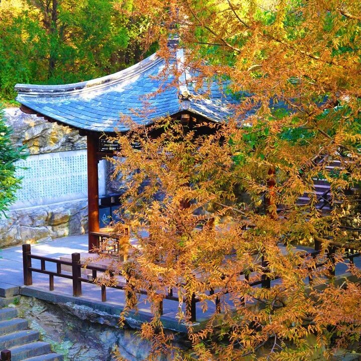 諧趣園涵遠堂東側(cè)、西側(cè)土石結(jié)合的假山上自然生長數(shù)十株北京鄉(xiāng)土樹種大果榆,秋色葉由橙色-紅色-棕紅色逐漸變化,與古建搭配,拍攝效果非常上鏡。