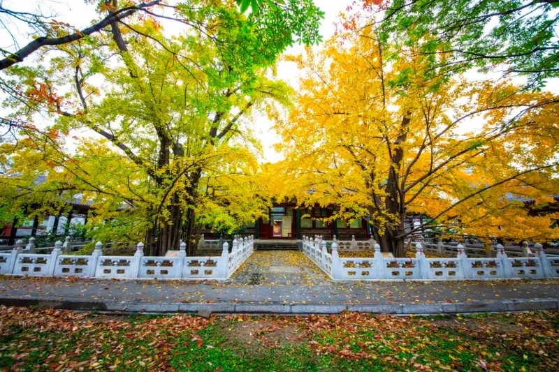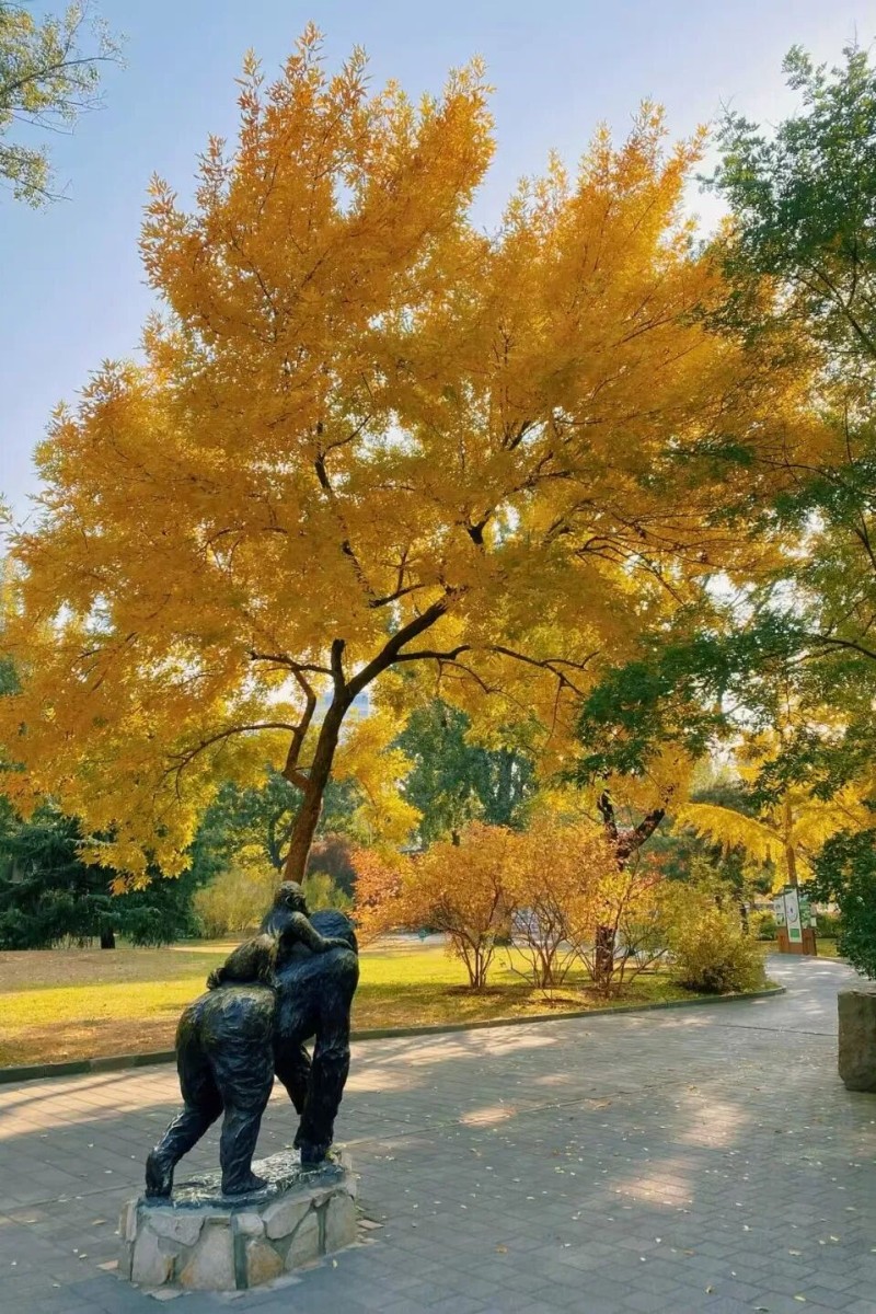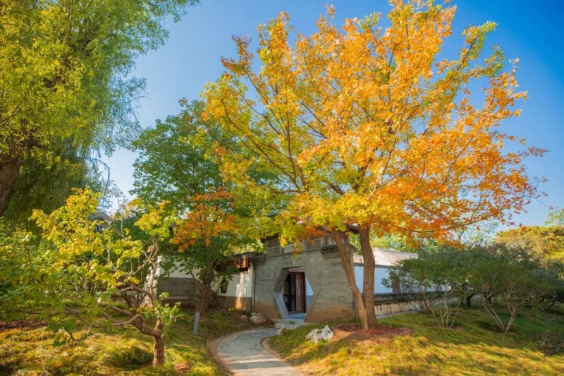 數(shù)十株高大銀杏組成銀杏林,秋季葉色金黃、落葉繽紛,在陽光下更為耀眼。