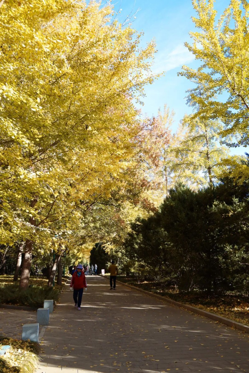 銀杏林依廊而植,高大舒展的枝葉在空中交織成一片綿密的葉網(wǎng)。漫步林間,金黃色的葉片在湛藍天空的映襯下鋪展成畫。
