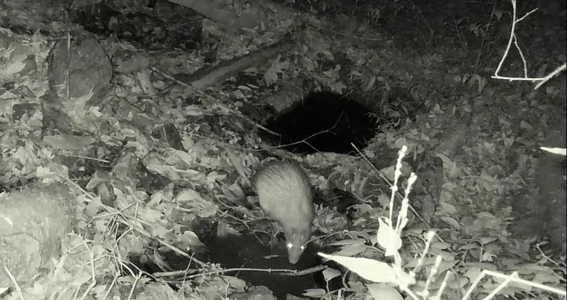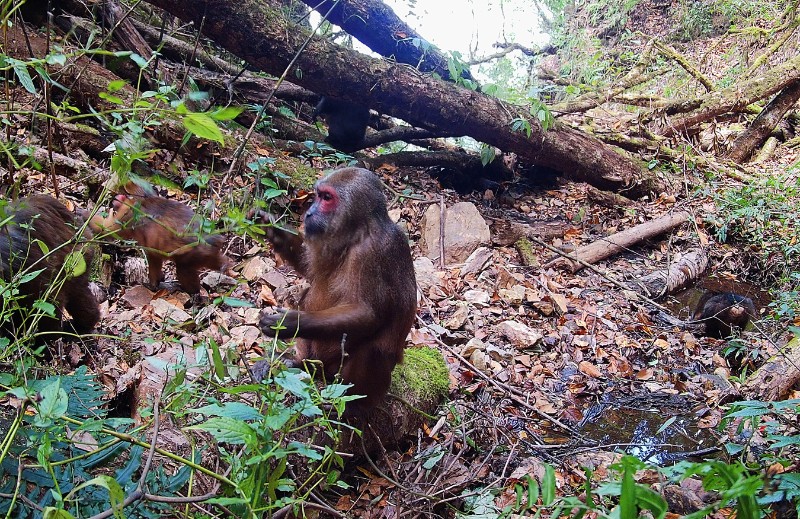 視頻里,藏在原始密林下的一處天然小水塘成為鳥(niǎo)獸飲水覓食共樂(lè)的“集結(jié)地”。在清澈的水塘邊,先是十多只點(diǎn)斑林鴿圍攏到水塘邊,有序排隊(duì)飲水。時(shí)不時(shí)還在水塘邊相互追逐嬉鬧,一派鴿舞雀悅的景象;隨后,獸類家族的短尾猴猴群也來(lái)到水塘邊,有的趴在塘邊低頭飲水,有的翻動(dòng)地上的石塊或枯枝落葉覓食,吃飽喝足后的猴群就蹲坐在石頭上休息眼神,過(guò)著一種逍遙自在的林間生活。還有一只調(diào)皮的半成年猴直接對(duì)著鏡頭玩起了自拍,留下了它一生中難得的“紅臉照”;當(dāng)夜幕降臨后,獸類“家族”的斑林貍、椰子貍和帚尾豪豬也趁著夜色來(lái)到水塘邊“夜游”。它們憑借自身敏銳的聽(tīng)力和視力,或在水塘周圍東張西望地尋找食物,或漫步到水塘邊喝水解渴,盡享“獨(dú)身”的安靜而愜意的“夜生活”。