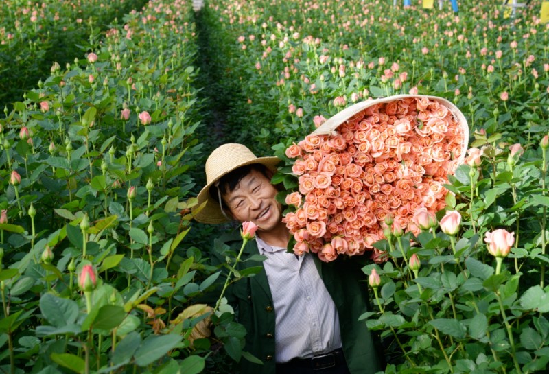 花農在晉寧康龍花卉種植基地采收高品質的粉玫瑰。楊崇云 攝