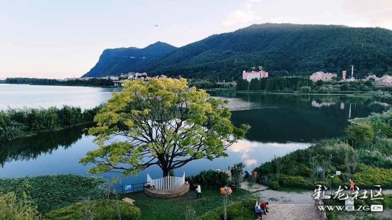 綠樹映水,遠(yuǎn)山含黛,游人漫步賞景。