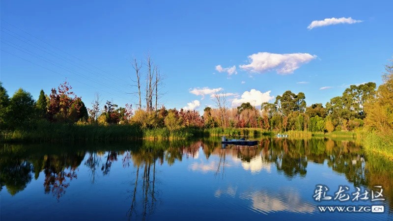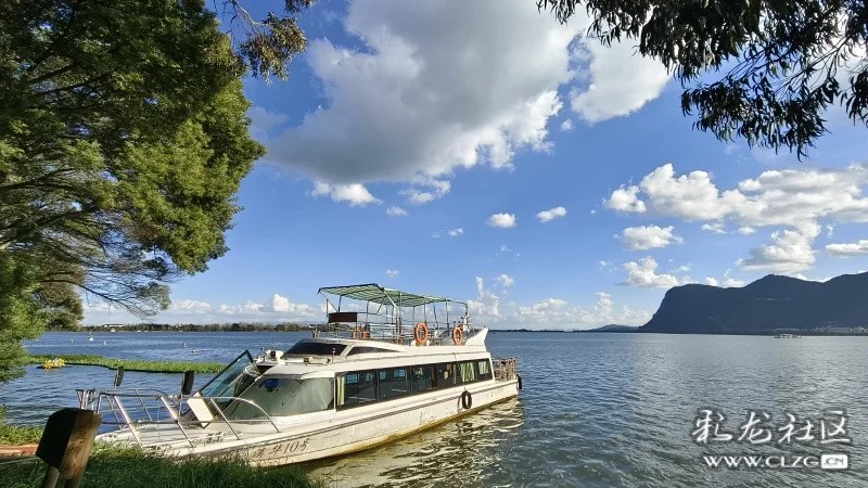 游船靜泊,藍(lán)天、白云、青山共繪悠然景致。